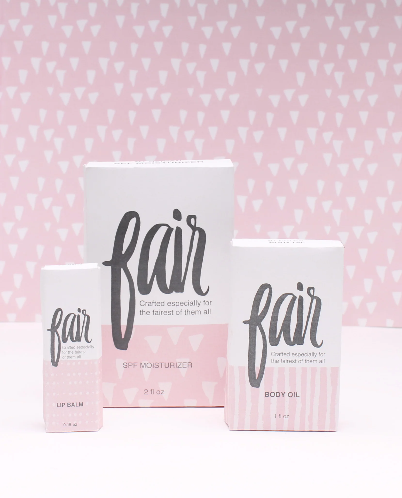 Fair is an original skin care line targeted toward the fair-skinned female. Three products were created: body oil, lip balm, and SPF moisturizer.